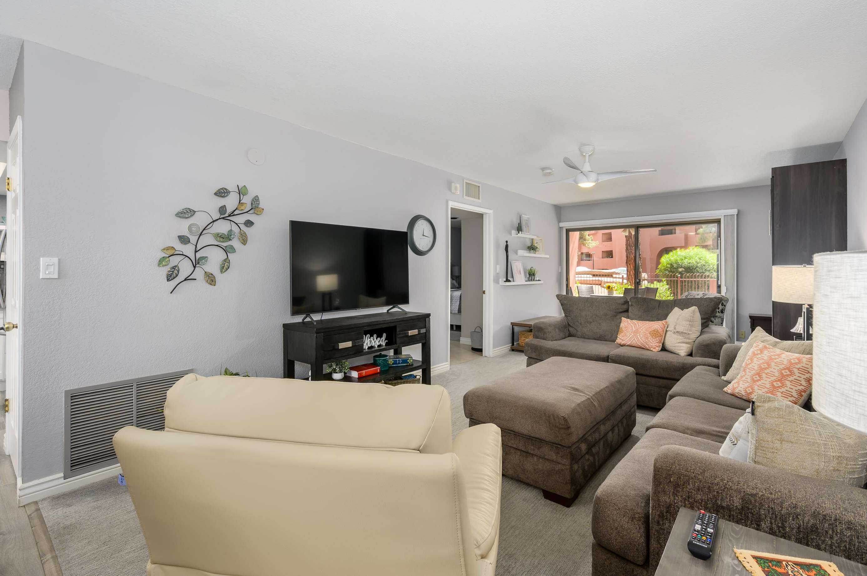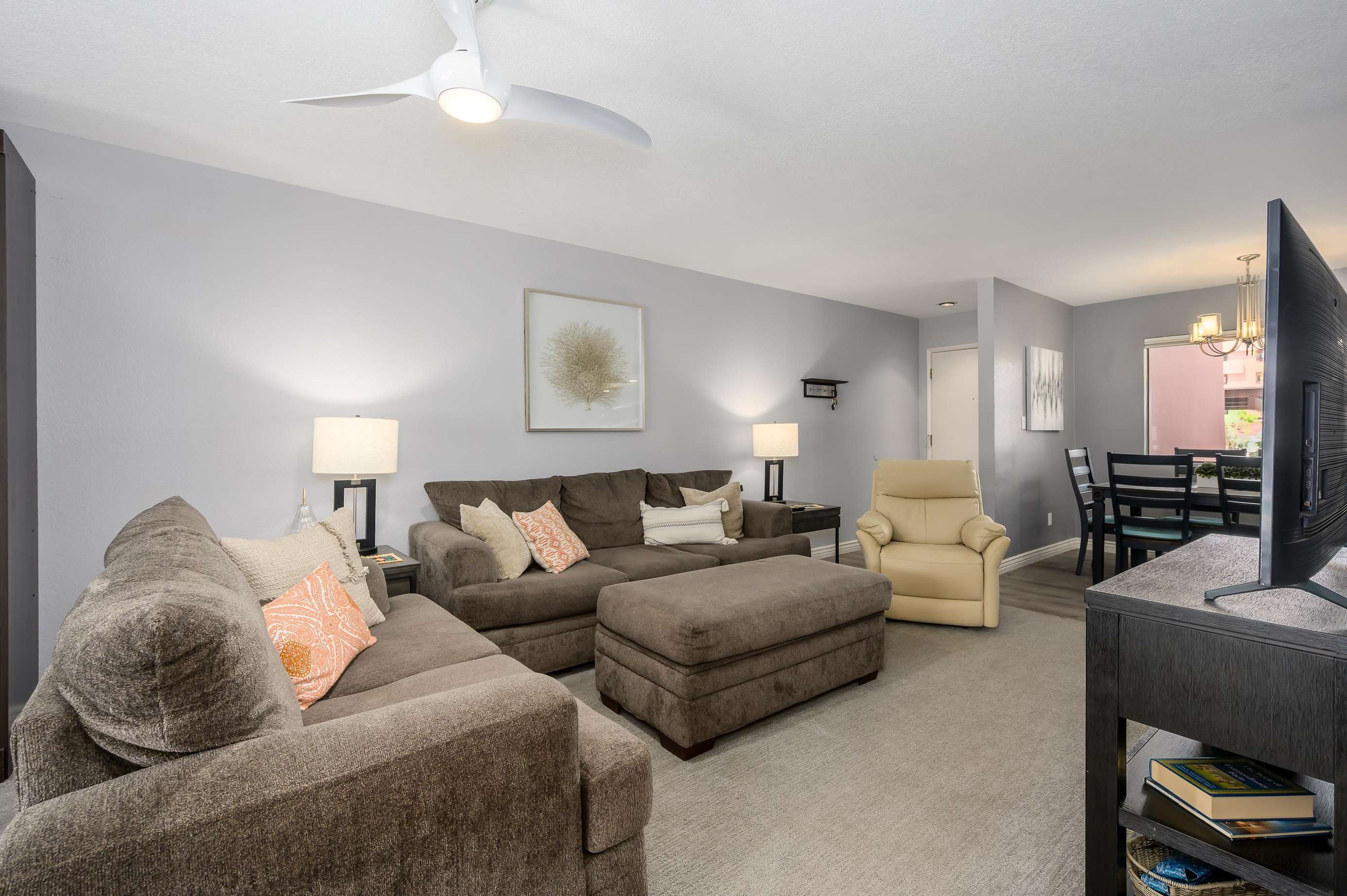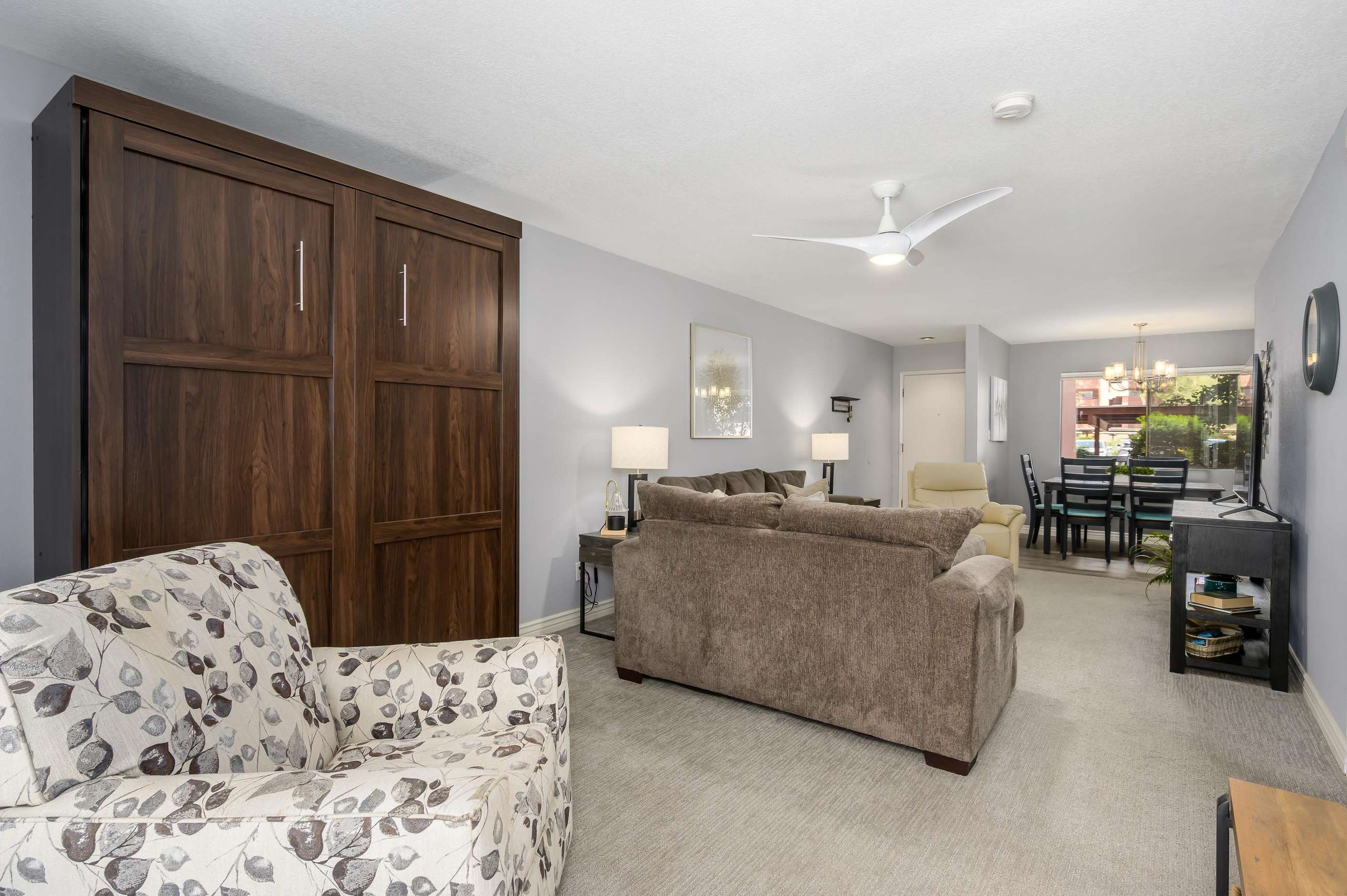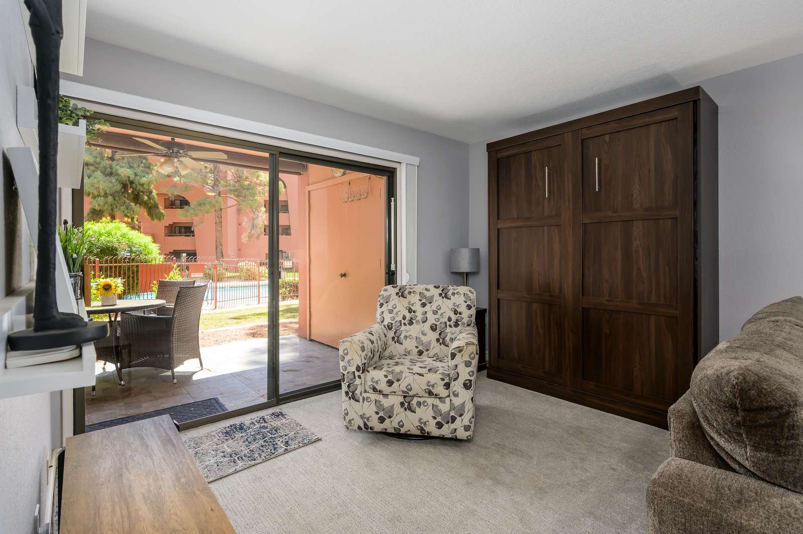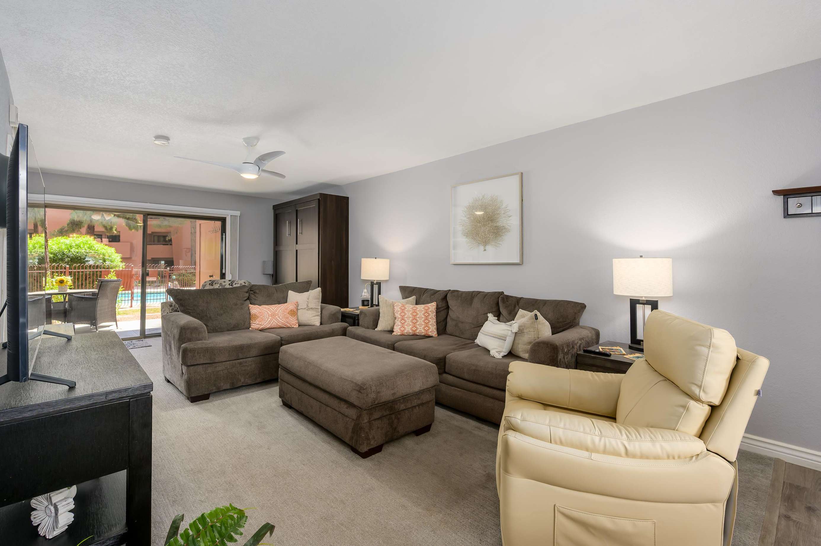 This unique ground floor unit has been updated and looks amazing. Open floor plan with plenty of seating and a new murphy bed. Patio looks out to pool number 2. Small dog friendly unit.